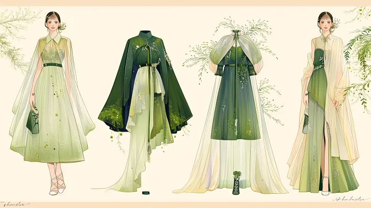 Generate clothing according to the above requirements: a total of four sets, one series of four sets arranged side by side in one image, mostly in the shape of A and X (there can also be others), not all with the same collar, design, length, collar, sleeve shape, pattern, make other changes, make them more distinctive, color effect pictures, models wearing clothes, full body, hand drawn style, can be seen as a series, pay attention to the silhouette, can be slightly exaggerated, require a design sense, combined with plant heat transfer printing, require a layered soft and ethereal style, refer to the picture style but do not copy it. --ar 16:9 --stylize 204 --niji 7 --sref https://images.gogpt.vip/aigf/m_origin/20260222/2061984/k05pd5l8pw2q0nx7.jpg