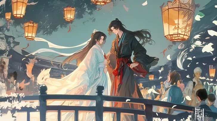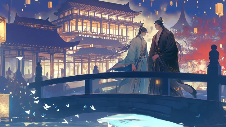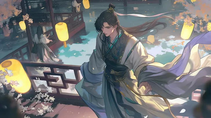 https://images.gogpt.vip/aigf/m_origin/20260221/1131737/67qxuerriej1n5ti.jpg https://images.gogpt.vip/aigf/m_origin/20260222/1131737/08b17gd7dzjlfzm6.jpg https://images.gogpt.vip/aigf/m_origin/20260221/1131737/235oh9znwlsal6j0.jpg https://images.gogpt.vip/aigf/m_origin/20260222/1131737/ucmmkiegz5svoxwn.png Ancient style illustration, horizontal composition, bird's-eye view, at night, a handsome boy in Hanfu walking on a bridge, background pedestrians passing by with lanterns, brightly lit, ancient pedestrians walking by in the background, flowing garments and hair, the overall picture is dreamy and hazy, light and shadow transition softly, details are exquisitely depicted without blurriness, the texture of glass and clothing is clearly visible, matching style and tone. --ar 16:9 --stylize 100 --iw 2 --niji 6