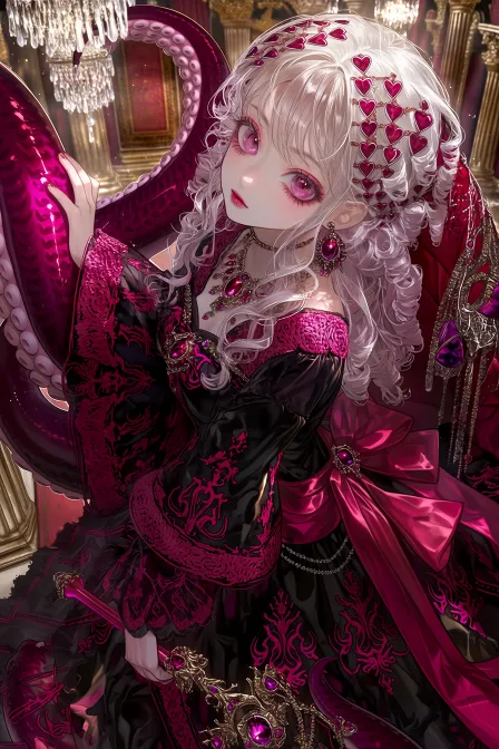 Cute female charm, 20 years old, noble temperament, charming and elegant luxury, with a romantic aura. The character occupies 83% of the screen, with a deep pink devil tentacle with a deep red pattern behind it. The tail is thick and curved, and the eyes are covered with deep crimson heart-shaped patterns. The pupils are a deep red color with a purple gradient. The character stands in a luxurious palace, with their body slightly tilted to one side, their head facing the camera, one hand resting on the devil's tail, and the other holding a crimson scepter. The camera uses a high angle to further enhance the character's sense of luxury. Face facing the camera, delicate and delicate facial features, straight nose bridge, bright and attractive eyes, reddish brown lips, soft and full texture. The white long curly hair is layered and fluffy, with each strand of hair clear and distinct. There are crimson gemstone hairpins embedded between the hair, and the hair hangs down on the shoulders, showing a noble temperament. A black velvet long dress adorned with intricate deep pink embroidery patterns, with a wide crimson waistband tied around the waist and wide cuffs designed to hang down to the ground. The fabric has a smooth and delicate luster. Accessories: Diamond earrings, crimson gemstone necklace, gold scepter embedded with deep purple gemstones, black silk high heels. The scene is a luxurious Gothic palace hall, with golden columns standing tall, crystal chandeliers shining brightly, and crimson tapestries hanging on the walls, creating a luxurious and romantic atmosphere. The hair strands are clearly defined, with delicate and thick coating, using a semi thick coating technique. Wide shoulders and slim waist. Fair skin, slender eyelashes, soft light and shadow. Ultra fine, sharp focus, high resolution, clear facial contours, complex clothing textures, wide perspective, soft light and shadow, close-up of the upper body, exquisite details, elegant color matching, semi realistic and semi thick painting style, delicate eyebrows and eyes, clear and focused image. The overall atmosphere is luxurious and romantic, with dark pink, crimson, and black as the main colors. The colors are rich and bright, and the layers of light and shadow are rich and bright. The movie level light and shadow highlight the noble temperament of the characters. Delicate skin texture, ultra-high definition, complex details, --ar 2:3 --stylize 100 --niji 7