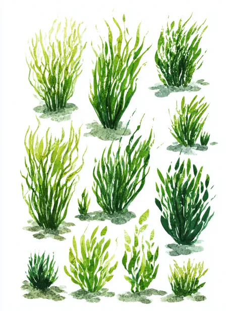 Illustration materials of multiple clusters of large and small green seagrass or seaweed, vector illustration material icon set design, outlined with ink pen watercolor. --ar 3:4 --v 7 --stylize 100 --no Character