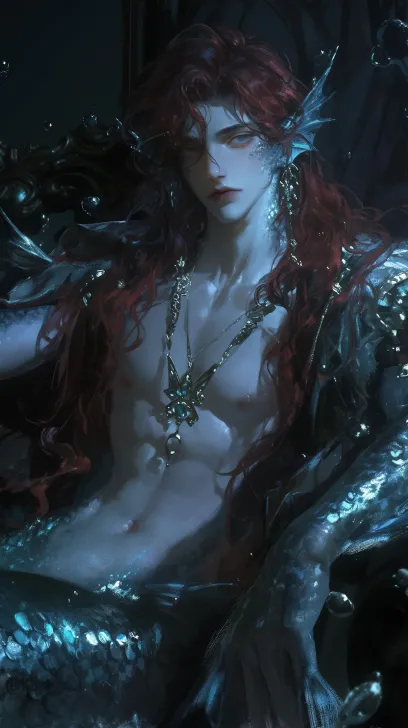 A non-human male mermaid, handsome, with long red hair, fish fin ears, delicate and three-dimensional facial features, eyes full of temptation, upper body with beautiful muscle lines, wearing a gold necklace, shoulder scales shimmering with light, deep sea palace background, surrounded by floating bubbles, sitting on a throne, frontal perspective, medium shot composition, thick painted two-dimensional illustration, high detail, 8k resolution, Unreal Engine 5 rendering style, cinematic quality, soft side lighting, highlight reflections, dark theme, sexy, exquisite. --ar 9:16 --stylize 338 --niji 6 --sref https://images.gogpt.vip/aigf/m_origin/20260223/1641788/9pxyelm67vdpyatf.png --sw 0 --sv 3 --profile spr1pcg 55pwzjj