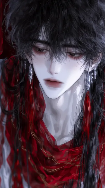 A portrait of a young swordsman, looking down, differentview, differentposs, he has long black hair that is loosely draped over his shoulders, slender eyelashes, his gaze lowered, with a cold and serious expression, well-defined eyebrows, and slightly pale skin. He is dressed in a flowing scarlet robe, edged with golden trim, wearing exquisite silver earrings adorned with red tassels. The color tone of the image is soft with shades of red and gray, featuring strong color contrasts and extremely detailed processing. The character occupies the entire screen, creating an overall dark atmosphere. The art style is anime realism, with a melancholic expression, black pupils, delicate eyes and eyebrows, with blurred and hazy lines, using anime-style rendering techniques. The character is slightly tilted to the left, creating an ethereal ambiance, with each strand of hair clearly defined, using elaborate thick paint and semi-thick paint techniques. Broad shoulders and a slender waist. Fair skin, long eyelashes, gentle light and shadow. Super fine, sharp focus, high resolution, clear facial contours, complex fabric textures with wide perspective, soft light and shadow, close-up of the upper body, exquisite details, elegant colors, semi-realistic semi-thick painting style, refined eyebrows and eyes, clear and focused image. The overall atmosphere is luxurious and romantic, mainly in deep pink, crimson, and black tones, with rich and bright colors, and layers of light and shadow that highlight the character's noble temperament, 8k resolution, perfect rendering, perfect composition, detailed anime illustration, hyper-detailed textures, soft lighting, 8K ultra-high definition, sharp focus on face, Artstation-quality. --ar 9:16 --stylize 200 --niji 7 --profile a6gxx5q --no 仰头,邪笑,血腥,仰视