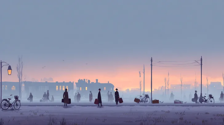2D side-scrolling scroll game background, horizontal composition, picture book illustration style. In the early morning, the sky presents a light blue-purple gradient, with a faint orange glow on the distant horizon. The square in front is spacious and open, with a slight morning fog covering the ground, and a few silhouettes of travelers carrying suitcases are moving around, while several vintage bicycles are parked at the edge of the square. In the distance, sparse tree outlines and streetlights can be seen, with soft and warm lighting. The overall color tone is gentle, based on gray-blue cool tones, with warm yellow light spots scattered throughout, creating a nostalgic and quiet atmosphere. No foreground buildings, no train station structures, the scene is open and transparent, suitable as a distant background layer for a side-scrolling game. --ar 16:9 --v 7 --stylize 100