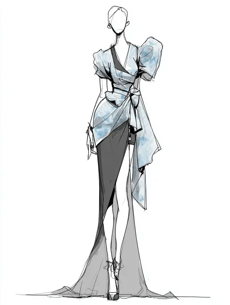 https://images.gogpt.vip/aigf/m_origin/20260323/2099193/tktriz8s07psb0m1.jpg Generate a full body fashion illustration using hand drawn reference images, including clothing illustrations, deconstructive designs, models wearing creatively asymmetrical designs, wax printing themes, UV leather fabrics, light blue and black formula schemes for personal clothing, front view, detail display, and a clean white background --ar 3:4 --v 7 --stylize 100 --iw 1.5