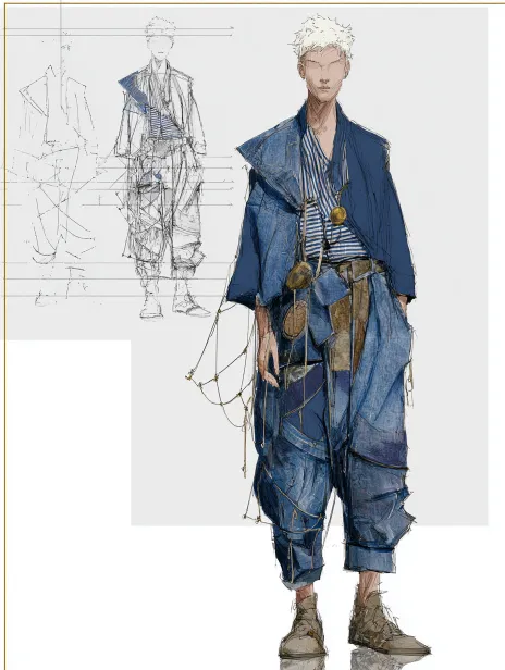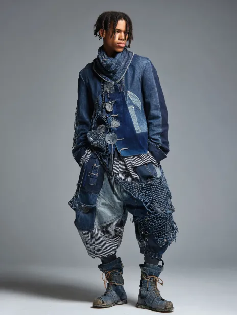 Men's clothing with pants as the bottom, featuring a denim blue deconstructive style, denim and suede fabrics, paired with a small amount of fishing nets and striped nautical elements. Referring to Yohji Yamamoto's clothing silhouette, the overall silhouette should be exaggerated. Three dimensional cutting clothing with fabric modification. --ar 3:4 --v 7 --stylize 100 --sref https://images.gogpt.vip/aigf/m_origin/20260323/2099182/31w46ony0ysv1b27.jpg --sw 8 --sv 1