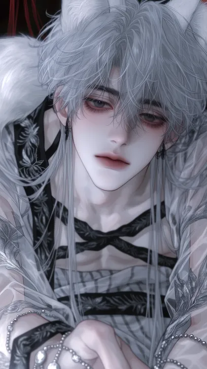 Portrait of a young ancient swordsman, looking down, differentview,differentposs, Close up of the face, he has long gray hair draped over his shoulders, with a 37 minute long bangs hanging down from his cheeks to his chest. He has a pair of white fox ears at the top of his hair, a white fox tail behind him, slender eyelashes, calm eyes, distinct eyebrow lines, and slightly pale skin. He is dressed in a lazy and seductive men's improved dark striped cross collar kimono, made of bright silver white semi transparent yarn material, with black edging on the cross collar hem and a black background silver wrapped flower dark pattern on the waistband. The semi transparent sleeves are embroidered with silver gray floral leaf dark patterns, paired with diamond chain round bead gemstone wrist accessories, with a graceful and ambiguous texture. It is a private and stylish men's clothing that is suitable for fox demon settings and exudes a lazy charm. The color tone of the picture is soft and slightly red and gray, with strong color contrast and extremely fine detail processing. The characters in the picture occupy the entire screen, creating a dark overall atmosphere. The art style is realistic anime style, with melancholic character expressions, black pupils, slender eyes and eyebrows, blurred and hazy lines, distinct hair strands, exquisite thick coating, and semi thick coating technique. Wide shoulders and slim waist. Fair skin, slender eyelashes, soft light and shadow. Ultra fine, sharp focus, high resolution, clear facial contours, complex clothing textures with wide perspective, soft light and shadow, close-up of the upper body, exquisite details, elegant color matching, semi realistic and semi thick painting style, delicate eyebrows and eyes, clear and focused image. The overall atmosphere is luxurious and romantic, with rich and bright colors, rich and bright layers of light and shadow, and movie level light and shadow highlighting the noble temperament of the characters. The resolution is 8k, perfect rendering, and perfect composition. --ar 9:16 --stylize 200 --niji 7 --profile a6gxx5q --no 仰头,邪笑,血腥,仰视
