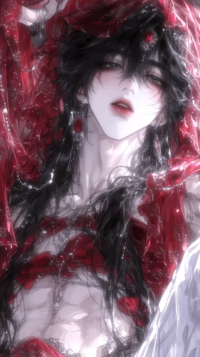 Ethereal boy, youth, young, black long hair, very long hair, slender and delicate figure. Wearing traditional red belly dance attire. Male. Semi-realistic art style, soft lighting, belly dance Arabic costume, veil, silk. Feminine, hermaphroditic, beautiful and slender, feminine youth, hermaphroditic, feminine figure, beautiful eyes, feminine features, very beautiful, gentle features, soft light and shadow, gentle, long eyelashes, looking down, differentview, differentposs --ar 9:16 --stylize 1000 --niji 7 --profile a6gxx5q --no 仰头,邪笑,血腥,仰视