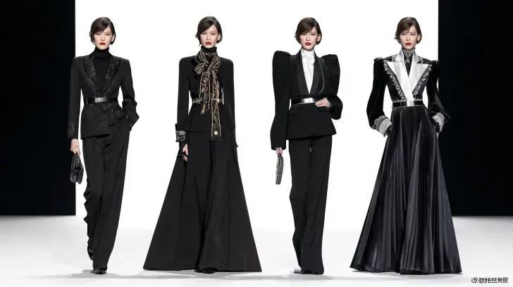 https://images.gogpt.vip/aigf/m_origin/20260323/2099283/rlc9gr4a1004ez55.jpeg https://images.gogpt.vip/aigf/m_origin/20260323/2099283/dv2j0ykpfca5i3z4.jpeg https://images.gogpt.vip/aigf/m_origin/20260323/2099283/wlnr7sz41t8lr1eb.jpeg https://images.gogpt.vip/aigf/m_origin/20260323/2099283/nml6rq0z60pqmjfz.jpeg I want a full-body fashion illustration with a hand-drawn feel. The theme of the fashion illustration is workplace authority. I want a Chinese model, and the outfit should have a sense of design and creativity. For this issue, I want a series of fashion effect drawings themed around the workplace, with avant-garde designs, incorporating silk fabric. I want a textured black, white, and gray color scheme, and I desire a stylish outfit effect with personality. The model should be shown from a frontal perspective, the clothing should have details, and the background should be white. Please generate 5 effect drawings of award-winning works. --ar 16:9 --v 7 --stylize 100 --iw 0.25 --sref https://images.gogpt.vip/aigf/m_origin/20260323/2099283/rlc9gr4a1004ez55.jpeg --no ,