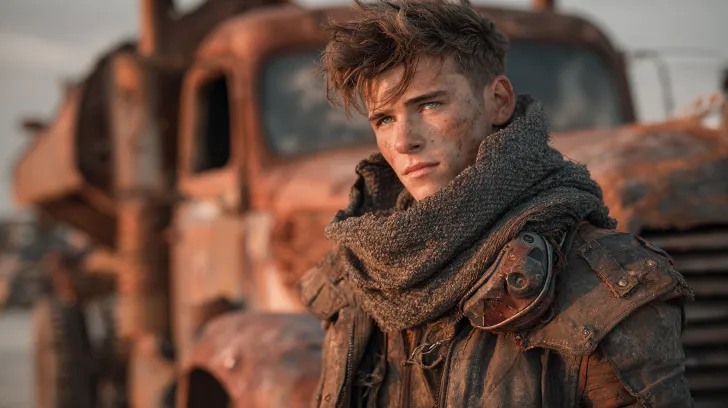 Features: A handsome young man with sharp edges, a slim physique, and a slightly melancholic gaze. Equipment: Heavy vintage leather jacket, homemade metal shoulder protectors, thick wool scarf, tactical gloves with rusty wrench. Environment: Standing in front of a huge rusty truck, with a dusty wasteland background, dramatic sunset light, and volume dust mist. parameter --ar 16:9 --v 7 --stylize 250