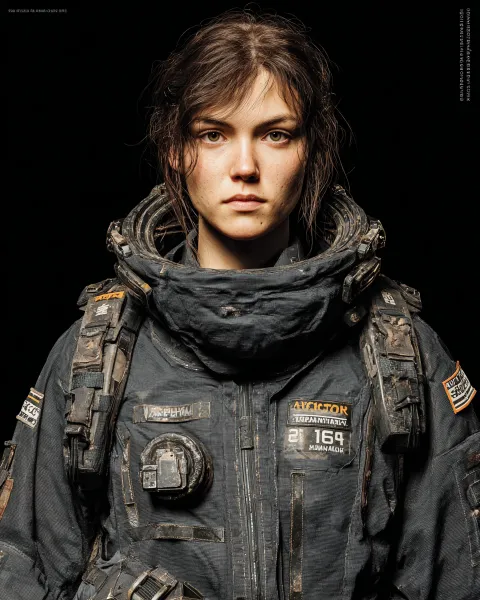 Super detail 8K, super realism, film quality, the "Alien" series of industrial science fiction style, no anime elements, no cartoon rendering, real character lighting logic; Female full body three view (front, 3/4 side, back), golden ratio figure, unified image and clothing; Prohibit bright colors, plastic textures, and exaggerated decorations; The skin has rough texture and slight scratches from long-term interstellar operations, and the fabric and equipment metal wear and oxidation texture are clearly visible. From a frontal perspective, she is a tall European and American woman who is 38 years old and is the security supervisor of an interstellar mining ship. She has a sharp and tough appearance, a sharp jawline, sharp and calm eyes, short and neat hair (dark brown), no excess makeup on the face, and old scars on the cheekbones; Wearing a dark grey vintage canvas workwear jumpsuit with reinforced and wear-resistant patches on the shoulders, a practical pocket on the chest (no fancy logo), a wide tactical waistband around the waist, and high top wear-resistant safety boots (with interstellar mineral dust on the upper), standing tall and straight, with hands naturally hanging down and rough palms with thin calluses, the overall temperament is rational and decisive: 3/4 Side view: The fabric adopts the classic cold industrial lighting effect of the movie "Alien", with a cold white top light outlining the skull outline, and side backlighting (weak warm yellow) highlighting the shoulder and back muscle lines and clothing folds; Standing posture with a slight sense of vigilance, the cuffs of the jumpsuit are rolled up to expose the forearm, which has slight abrasions; The left shoulder crossbody multifunctional tool kit (with visible contours of built-in wrenches, emergency flashlights, and other tools), a portable breathing mask hanging on the waist side, severe wear on the sole of the work boots, and mineral sand stuck in the shoe seams; The facial light and shadow contrast is strong, highlighting the tough facial features and calm gaze: Back perspective: There are multiple patches on the back of the workwear jumpsuit (with obvious stitching marks of different materials), and the skin on the back of the neck has strangulation marks and is sunburned due to long-term wearing of the helmet; The folding portable pry bar is mounted on the back waist, and the indentation on the tool kit strap is clear; Tighten the pant legs and tie them into the boot, with slight scratches on the outside of the boot; The overall equipment meets the survival needs of interstellar operations, with no redundant design. Clothing and equipment are covered with natural traces of use, and the effects of oxidation, wear, and dust adhesion are real, which conforms to the texture of long-term interstellar drifting --ar 4:5 --v 7 --style raw --stylize 250