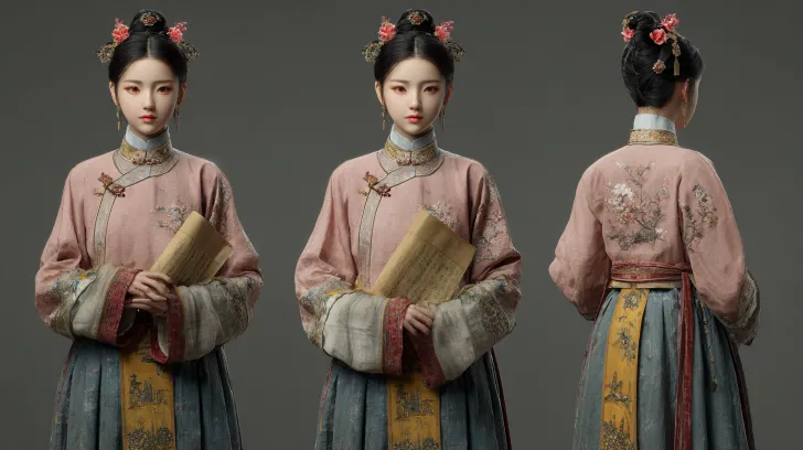 Super detail 8K, super realism, surreal style, movie level effect, three views of the role of the Ming court female doctor, unified image and clothing (three views) Full body front: 21 year old Ming Dynasty beauty doctor, beautiful facial contour, a touch of red flowers on the forehead, a touch of yellow eye shadow, beautiful facial features, no zipper/plastic/bright colors, Ming Dynasty Han Dynasty women, stand collar Pipa sleeve blouse+pony skirt, light pink blouse, front and cuffs decorated with beige red texture gold trim, gold mother buttons, gray blue pony skirt, the skirt body has a landscape pavilion gold pattern and Gold bottom edge. Comb a high bun, insert a wooden hairpin, look down at the light brown scroll in your hand, with a gentle and calm expression and clear fabric texture. 3/4 Side: Standing posture, delicate hands, full body picture Back: Beautiful standing posture, full body picture --ar 16:9 --v 7 --stylize 100