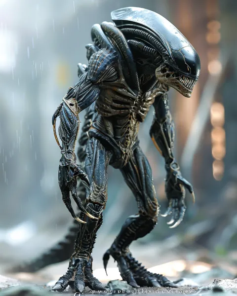 Super detail 8K, super realism, film quality, classic science fiction and horror biological aesthetic inspiration, no anime elements, no cartoon rendering, pure original biological design; Original science fiction predatory creature full body three views (front, 3/4 side, back), golden ratio body shape, unified biological form and body texture; It is prohibited to directly replicate any iconic details of film and television IP, bright colors, and exaggerated distortions; The exoskeleton has a matte carbon black texture, and the body muscle lines and biological joint structure are original designs. The body surface has natural scratches from the interstellar environment, without any wear and tear from the same film and television. Features:: Front view: Original wedge-shaped streamlined head (no copyright related head structure design), no exposed eye structures on the face, and a tight mouth contour (original oral tissue morphology, no specific film or television biological signature internal nest tooth replica); Streamlined chest, original raised curvature of shoulder exoskeleton, two pairs of original proportional upper limbs (slender forelimbs with hooked claws, thick hind limbs supporting the body), and original arrangement of abdominal muscle texture; The long tail is thick and powerful, with original sharp bone spurs at the end; The standing posture is intimidating, with a slight forward tilt of the body and a natural matte texture of the exoskeleton. The original interstellar mineral dust and environmental traces are attached to the body surface: 3/4. Side view angle: The fabric adopts a cold industrial landscape design, with a cold blue top light outlining the original streamlined contours of the head and spine, and a side backlight (weak blue gray tone) highlighting the matte texture of the exoskeleton and the original muscle undulations; Clearly display the original wedge-shaped curvature of the skull's side, the contracted state of the mouth, the original folding structure of the forelimb joints, and the original curvature and bone spur details of the long tail's natural sagging; The seams of the exoskeleton on the side of the body are designed with original textures, and the leg muscle lines highlight explosive power. The claw tips have original wear marks, and the overall posture is hidden with aggression. There is no film or television IP biological replica of the same posture: Back perspective: Displaying the original segmented exoskeleton structure on the back, the spine protrusion is designed with original longitudinal lines, and the shoulder exoskeleton is symmetrically raised with original contours; The texture of the muscles at the root of the hind limbs and the connection with the exoskeleton are original details, and the connection structure between the long tail root and the body is an original design; There are original minor scratches and abrasions on the back surface (simulating natural traces of shuttling through interstellar spacecraft and climbing metal pipes, not the same scratch features as the film); No unnecessary growths, fully following the original minimalist deterrent design concept; Weakened light and shadow, highlighting the three-dimensional sense of the back structure, matte exoskeleton with low light reflection effect. Original tuning: Copyright statement: No reproduction of any film or television IP copyright elements, pure original science fiction biological form/texture/body proportion, rejecting the same design as film or television, highlighting the survival adaptability characteristics of original organisms --ar 4:5 --v 6.0 --style raw --stylize 280 --no 影视 IP 生物同款细节,复刻造型,标志性器官