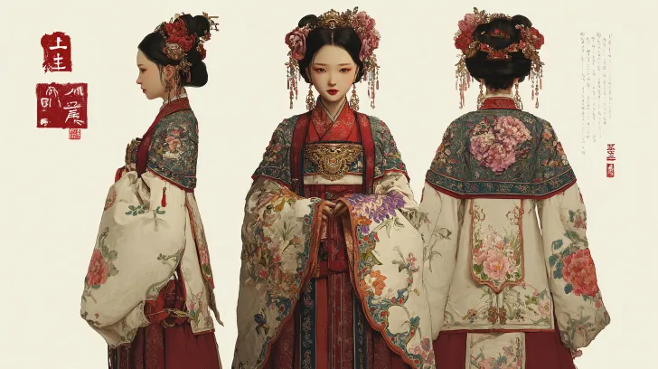 https://resource.gogptai.com/aigf/origin/20260323/1774236128758314.png Ancient style Chinese beauty, three view layout, front view centered, left side view on the left, back view on the right, pure white background, same character, meticulous white drawing style, full body portrait --ar 16:9 --v 7 --c 5 --stylize 202 --iw 0.25 --no 文字