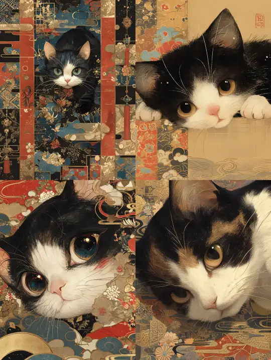 00:15:34提示词:A Song embroidery artwork with ink brush thread, depicting a cute cat from a frontal perspective, using a telephoto close-up lens to highlight details and dynamics, with ink brush strokes permeating through it. The Chinese red and indigo background is covered with auspicious cloud patterns on gold foil, and the Xuan paper background presents the artistic style of Emperor Huizong of Song Dynasty. The overall composition is harmonious and full of vitality, making people intoxicated by the classical beauty and natural shock. --niji 6 --ar 3:4 --s 541