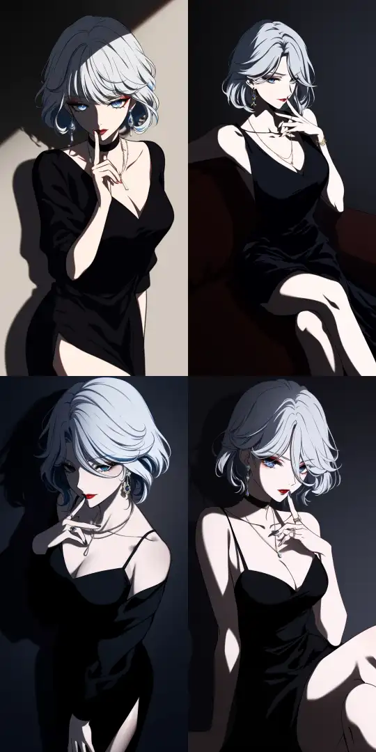 00:01:19提示词:1 girl, Furina,Genshin Impact, Alone, blue hair, highlights, short hair, bangs, blue eyes, leg and above photos, eye shadow, earrings, necklaces, rings, collars, red lipstick, black dress, two fingers against the lips, mouth closed, side shot, looking at the camera, simple, clean, character strokes, strong lines, 16K, super details, no impurities, blank, animation style --sref