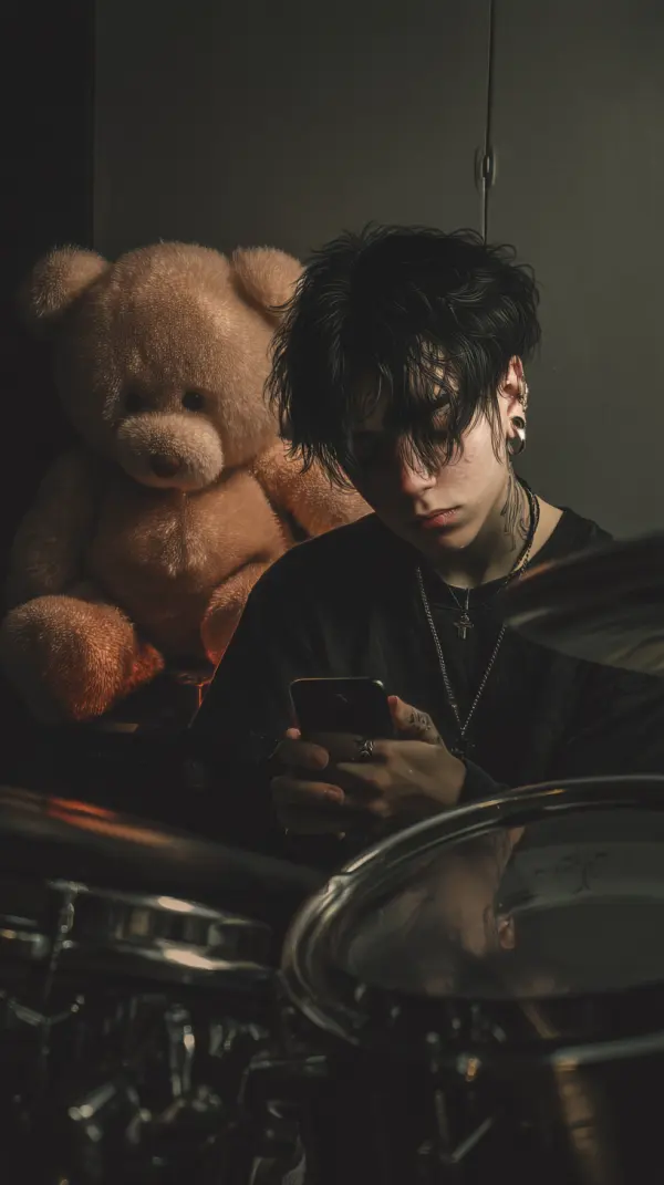 00:02:12提示词:从上往下看,一个留着黑色短发、戴着黑色耳环的年轻人坐在一个鼓架前,鼓架上放着一个泰迪熊玩具,右手拿着智能手机,盯着屏幕。音乐室灯光昏暗,手机屏幕发出的柔和光线照亮了他的脸和手。整体氛围偏暗,黑色调,这幅画是一幅高质量的数字插图,将逼真细腻的细节与动漫风格特征相结合。油画和厚涂层风格的质感,是从侧面捕捉到的,捕捉到了这个安静的时刻——niji 6-s 1000 ar 9:16——没有侧面、侧面、多个手指、缺少手指、断裂、不正确——v 6.1——图像 --ar 9:16 --v 7 --stylize 100 --sref https://images.gogpt.vip/aigf/m_origin/20250502/1534679/olq25zse9aui6iz1.png --sw 19 --no 其他颜色的打光