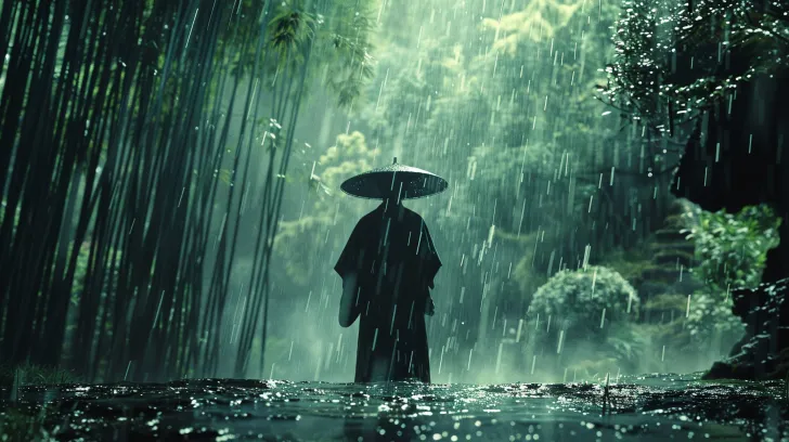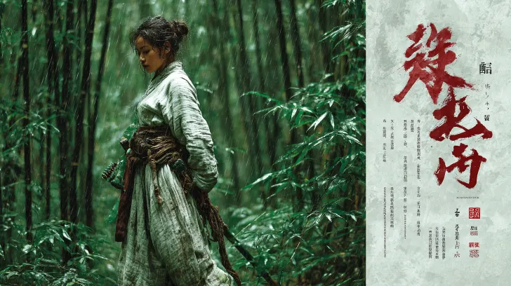 Midjourney Bot 更新时间:2026-04-01 00:04胡金铨武侠电影风格,中式写意美学,宋禅宗留白,长衫侠客站在茂密的竹林中,高高的茅草丛,下着大雨,地面有一个小小的水坑,雨滴落进水坑,水花溅起,,院线级电影光影,景深虚化,古风暗调。年代质感+胶片专属关键词:1960年代至1980年代武侠片,非自然主义光影,邵氏综摄宽银幕构图,1960年代末至1970年代初东亚彩色宽银幕(Eastmancolor/Cinepanoramic)质感,人工布光,特艺彩色取向,老胶片成像质感,复古柯达2383胶片质感,浓重胶片颗粒。画质+细节+氛围关键词:超写实风格,8k分辨率,逼真质感,高对比度,深邃阴影,24毫米广角镜头视角,精致刺绣纹理,神秘而宏大的武侠氛围。 --ar 16:9 --v 6.0 --stylize 250