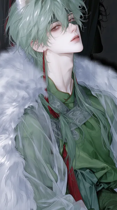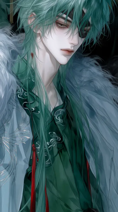 Midjourney Bot 更新时间:2026-04-01 00:04英俊的古风长发东亚青年,白皙的皮肤,深棕色眼睛,狭长忧郁的眼睛,高鼻梁,闭嘴薄唇,((鹅蛋脸)),侧脸,下颌线分明,五官棱角分明,完美精致的五官,细腻的面部特征,身材纤细窄腰,优雅无赖,花花公子气质,冷漠的眼神,长长的青绿色发,青绿色及腰,三七分刘海部分遮住眼睛,水墨风古风长袍,毛茸茸白狐裘披风,整体以不同层次的绿色做叠搭,深翠绿色交领里衣,衣缘绣银白水云纹样,外层罩烟青色多层宽袖外袍,最外层半透青灰罩纱,质感飘逸,垂落的红飘带点缀前襟,清冷禁欲,性感,动感姿势, (((((((脸上戴着黑色眼纱遮住双眼)))))),阴郁的表情,背景幽暗模糊。 --ar 9:16 --niji 7 --profile a6gxx5q --no 仰头,邪笑,血腥,仰视