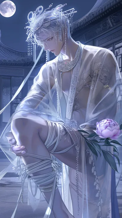 Midjourney Bot 更新时间:2026-04-01 00:05一个俊美动漫男人,乌沙+玉+银质+镂空花丝+点翠+卷草纹+刺绣拉丝幞头, beads fringe+threads fringe,藕荷色珍珠吊链 挂脖式 轻纱旗袍+幻彩竹叶+暗纹牡丹提花+, 绳子shibari身体,只露出一条腿,身上裹着轻纱,冷白色清澈白皙的皮肤,手里拿着一朵牡丹花,背景是月夜下的古式庭院,动漫插画,线条流畅 --ar 9:16 --style raw --stylize 100 --niji 6 --no no