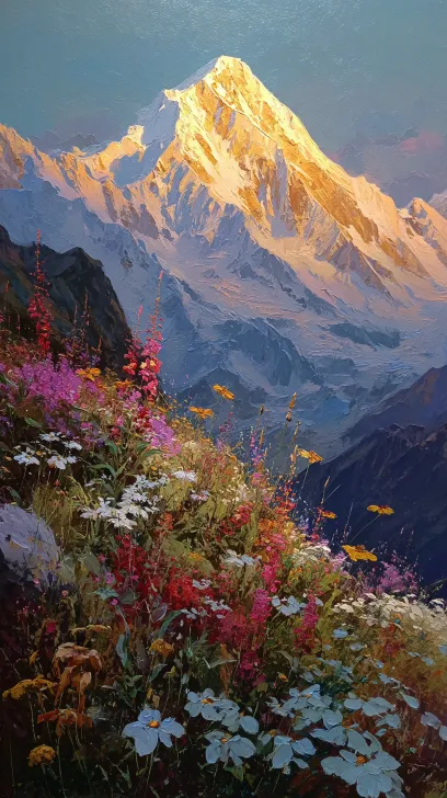 Midjourney Bot 更新时间:2026-04-01 00:13、 一幅令人叹为观止的写实油画,拥有摄影般的细节——壮丽的金色雪山(日照金山)沐浴在柔和的朝阳中,山顶闪耀着温暖的琥珀色与金色光芒,与岩缝间冷峻的宝石蓝和藏蓝色明暗形成鲜明对比。前景繁花似锦,盛开着各种野花,五彩缤纷,彩色艳丽,高饱和度,花瓣纹理极致细腻,以微距镜头的锐度呈现花卉细节,兼具电影级光影质感。杰作级画质,8K分辨率,融合摄影写实与古典油画厚涂技法-style raw --ar 9:16 --v 7 --stylize 100