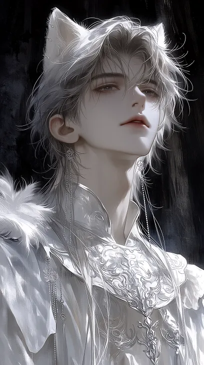 Midjourney Bot 更新时间:2026-04-01 00:14轻盈,正面,风格慵懒奢华,全身特写,照片质感略带颗粒感,光线昏暗,男性,古老中国风格,年轻,面部特征鲜明深邃,长直白发,披散,微乱,病态,半侧面,低饱和,复古高端,狐妖, 树林背景,带着戏谑,蛊惑的目光,目光游移,白狐耳朵,尾巴,脖子上戴着流苏项链,目光冷冽迷人,不露出腹肌和胸肌,白袍,圆领绣有羽毛和吉祥云朵, 皮肤质地清晰,白皙,半身距离,近身半厚画风,正脸,慵懒奢华风格,全身特写,画面带点颗粒感,柔光,发丝边缘光,超精细发丝,画面颜色灰白色,复古高端,8高清 --ar 9:16 --stylize 1000 --niji 7