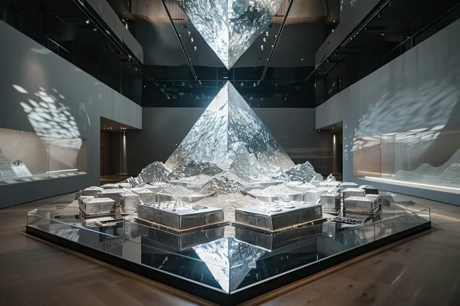 Midjourney Bot 更新时间:2026-04-01 00:15博物馆沉浸式空间,古代银元宝为元素,阵列堆积成金字塔形,顶面镜面反射, --ar 3:2 --v 6.0 --stylize 100