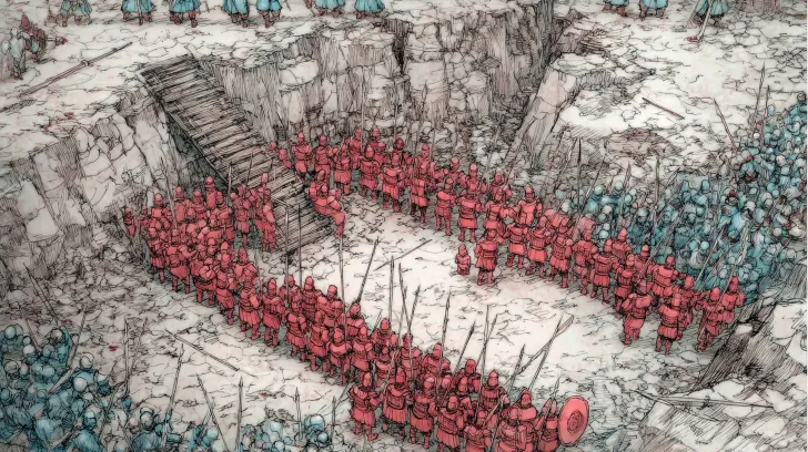 Midjourney Bot 更新时间:2026-04-01 00:16战国时期,巨大土坑里红色军队士兵放下武器,双手抱头,神色惶恐。蓝色军队士兵手持长刀、弓箭围着土坑,面色冷漠,Manga style, --ar 16:9 --v 7 --stylize 100 --sref https://images.gogpt.vip/aigf/m_origin/20260401/2098042/0r7cgckhxdaor64a.png