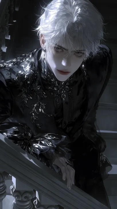 Midjourney Bot 更新时间:2026-02-07 00:07采用暗黑细腻的厚涂画风,写实,一位帅气且妖艳的男性人物,细腻的白色中长发,银色的耳钉,人物的狭长丹凤眼眼深色瞳孔,高鼻梁,窄长脸型,薄唇。眼神危险,阴湿,整体画面极致超清,细节处理极致,营造出一种神秘而魅惑的氛围,表情病娇占有欲强,穿着带有设计感荷叶边袖子,高领领口镂空抽绳设计,英伦欧美风宫廷长袖个性黑色衬衣,黑色裤子,站英伦宫廷风的灰黑为主调的古堡内楼梯上,靠在楼梯上斜靠栏杆,居高岭下看着镜头 --ar 9:16 --stylize 1000 --niji 7