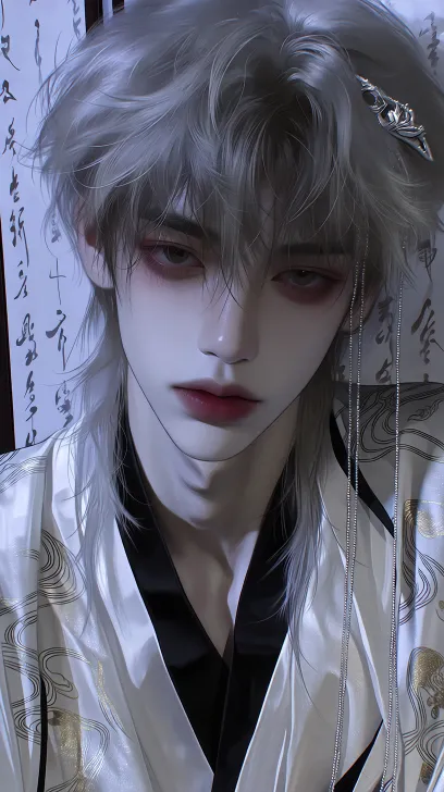 Midjourney Bot 更新时间:2026-02-07 00:08一个极具古风仙气的男性,整体风格偏向清冷出尘的国风美男子设定。一头蓬松的银灰色长发,层次丰富且带有自然卷曲,发丝轻盈蓬松,头顶搭配精致的银色发饰,点缀着垂坠的珠链,增添了飘逸感与贵气。采用偏柔美的国风妆造,底妆清透白皙,眼妆以深邃的红棕色调晕染,拉长眼型并突出清冷氛围感,眉型纤细锋利,整体妆面兼具柔美与锐利感。身着带有传统纹样的国风服饰,衣料以米白为底色,搭配黑色镶边与金色暗纹,局部还有水墨风格的图案,面料带有光泽感,尽显华贵雅致的气质,背景是古风屏风,书法 --ar 9:16 --c 80 --stylize 750 --niji 7 --sref https://images.gogpt.vip/aigf/m_origin/20260206/2041557/n4fgrr3n63q3o0nu.jpg https://images.gogpt.vip/aigf/m_origin/20260206/2041557/my4sj5cnma83z7vq.jpg https://images.gogpt.vip/aigf/m_origin/20260204/2041557/20558uvber0gease.jpg --sw 220