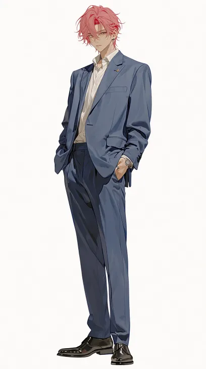 Midjourney Bot 更新时间:2026-02-07 00:12英俊的东亚青年,伪真人 ,冷白皮,深棕色眼睛,狭长冷漠的眼睛,高鼻梁,薄唇,((长尖脸)),下颌线分明,锁骨清晰,五官棱角分明,冷峻细腻的面部特征,优雅无赖,花花公子气质,高贵不可侵犯的气质,时尚潮流的粉色短发,刘海部分遮住眼睛,左耳极简银耳钉, 左手结婚戒指,西装外套,衬衫,长裤,皮鞋,浅蓝色白色,站立姿势,专注表情,白色背景,全身立绘图 --ar 9:16 --stylize 600 --niji 7 --no 文字,字母,水印,纹身