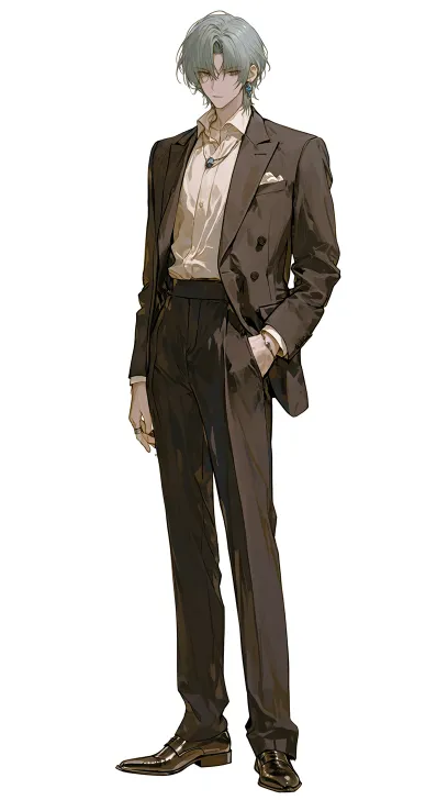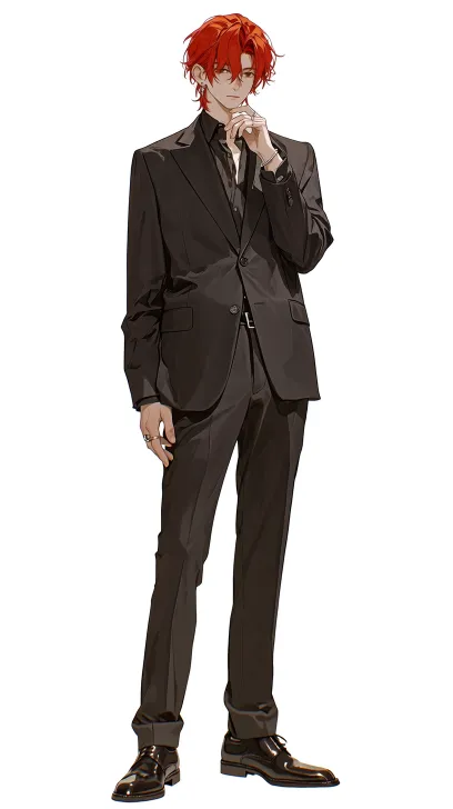 Midjourney Bot 更新时间:2026-02-07 00:15英俊的东亚青年,伪真人 ,冷白皮,深棕色眼睛,狭长冷漠的眼睛,高鼻梁,薄唇,((长尖脸)),下颌线分明,锁骨清晰,五官棱角分明,冷峻细腻的面部特征,优雅无赖,花花公子气质,高贵不可侵犯的气质,时尚潮流的红色短发,刘海部分遮住眼睛,左耳极简银耳钉, 左手结婚戒指,西装外套,衬衫,长裤,皮鞋,黑色灰白色,站立姿势,专注表情,白色背景,全身立绘图 --ar 9:16 --stylize 600 --niji 7 --no 文字,字母,水印,纹身