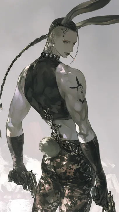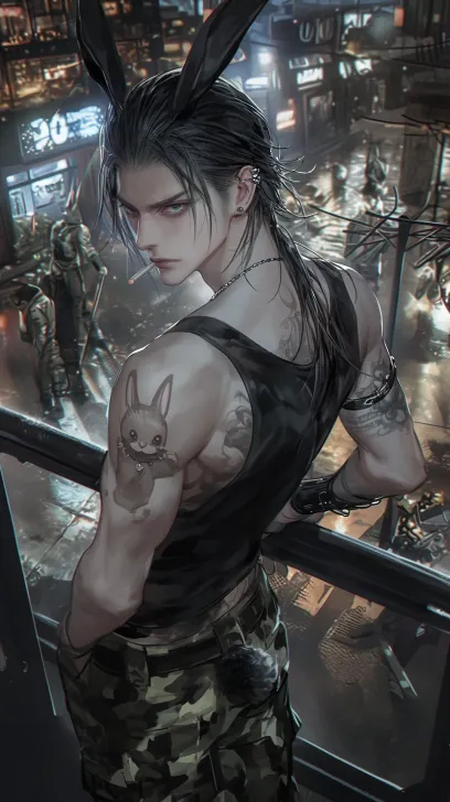 Midjourney Bot 更新时间:2026-02-07 00:18年轻男性角色,黑色头发,背头,头发后梳,冷白皮肤,背头,头发后梳,迷彩服,头顶长着一对垂耳兔兔耳朵,身后兔尾巴,时尚暗黑风格、肌肉力量感姿态,线条细腻精致,着重刻画皮革光泽、脸部线条及金属装饰细节,人物姿态展现个性与力量,融合暗黑时尚元素,俯视镜头,整体氛围冷峻且富有视觉冲击力,背对镜头,回头,纹身,嘴里叼着烟,背景随机,热武器,低角度仰拍 --zoom 1.5 --ar 9:16 --style raw --stylize 500 --niji 6