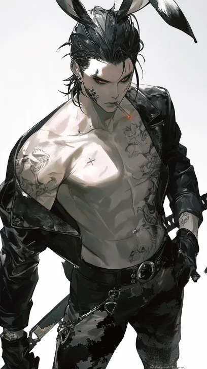 Midjourney Bot 更新时间:2026-02-07 00:18年轻男性角色,黑色头发,背头,头发后梳,冷白皮肤,背头,头发后梳,黑色迷彩服,头顶长着一对垂耳兔兔耳朵,身后兔尾巴,时尚暗黑风格、肌肉力量感姿态,线条细腻精致,着重刻画皮革光泽、脸部线条及金属装饰细节,人物姿态展现个性与力量,融合暗黑时尚元素,俯视镜头,整体氛围冷峻且富有视觉冲击力,背对镜头,回头,纹身,嘴里叼着烟,背景随机,冷兵器,低角度仰拍 --zoom 1.5 --ar 9:16 --style raw --stylize 500 --niji 6