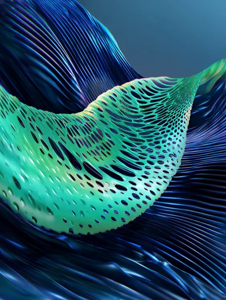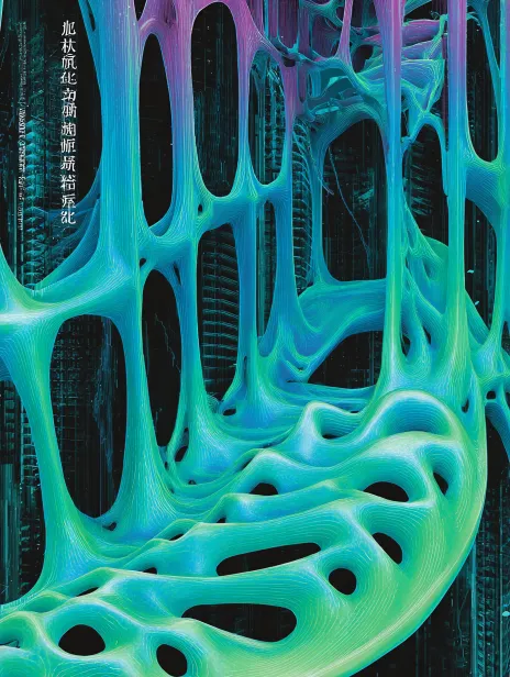 Midjourney Bot 更新时间:2026-02-07 00:15背景以渐变的蓝绿色为主,营造出水润的质感。中央有流动感的长方形形状,呈现出不规则的曲线和孔洞,给人一种有机的感觉。 --ar 3:4 --v 7 --stylize 100 --sref https://images.gogpt.vip/aigf/m_origin/20260207/2051902/6vrpiurr3xn5y2fd.jpg --sw 1000