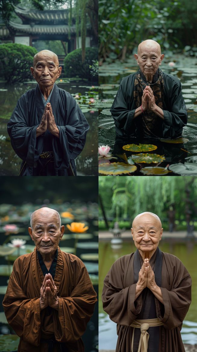 Midjourney Bot 更新时间:2024-03-29 00:03A kind Chinese old monk, bald, with a round face, wearing a Taoist robe, hands clasped in prayer, and bright and lively eyes, looks at the camera and the scene is by a temple pond, --ar 9:16 --v 6.0