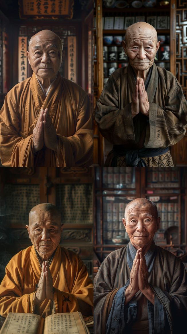 Midjourney Bot 更新时间:2024-03-29 00:00A kind Chinese old monk, bald, with a round face, wearing a Taoist robe, hands clasped together in prayer, eyes bright and lively, looking at the camera, the scene is a temple study, filled with scriptures, --ar 9:16 --v 6.0