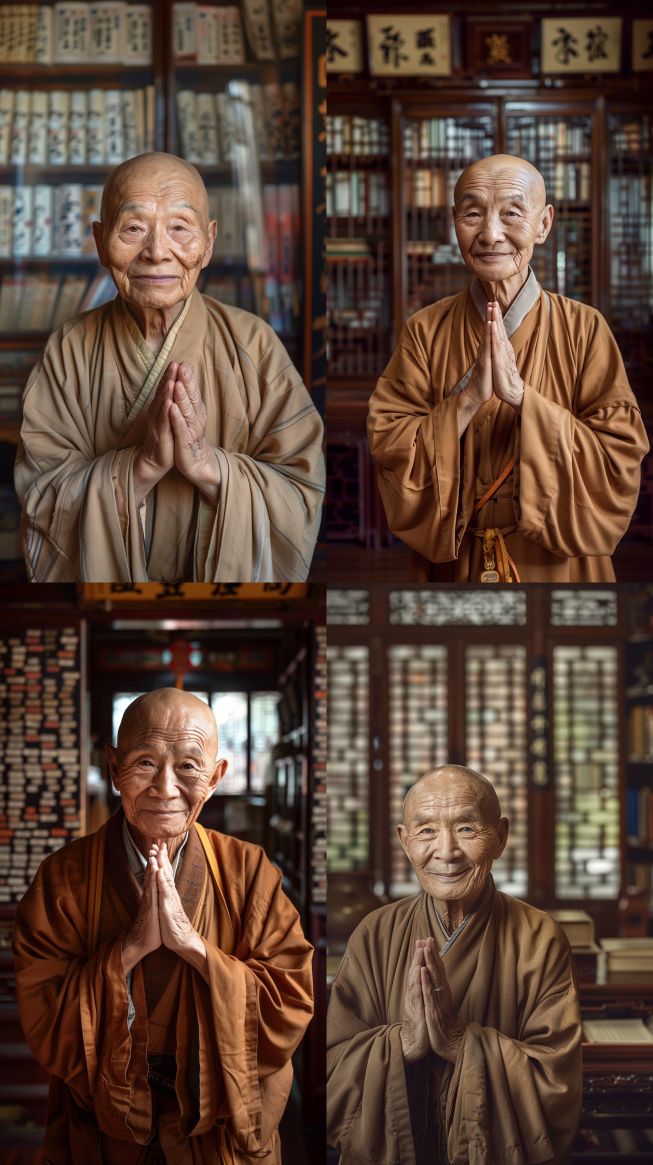 Midjourney Bot 更新时间:2024-03-28 00:00A kind Chinese old monk, bald, with a round face, wearing a Taoist robe, hands clasped together in prayer, eyes bright and lively, looking at the camera, the scene is a temple study, filled with scriptures, --no Dragon, black and white, anger, repeated images, chubby, chubby, sideways --ar 9:16 --v 6.0
