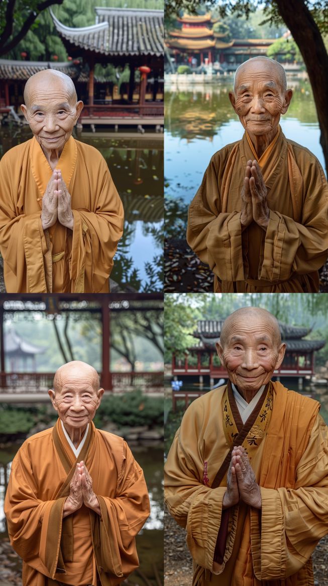 Midjourney Bot 更新时间:2024-03-28 00:03A kind Chinese old monk, bald, with a round face, wearing a Taoist robe, hands clasped in prayer, and bright and lively eyes, looks at the camera and the scene is by a temple pond, --no Dragon, black and white, anger, repeated images, chubby, chubby, sideways --ar 9:16 --v 6.0