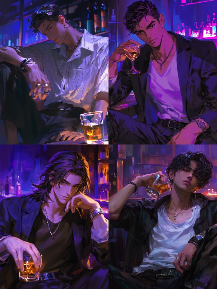 Midjourney Bot 更新时间:2024-03-27 00:00Japanese and Korean painting style, with highly linear brushstrokes, wearing a black and white baseball suit on the outside, a t-shirt on the inside, a detailed depiction of the handsome face, a super cool handsome guy wearing a necklace, handsome, with a dark purple color tone, disdainfully looking at the camera, bars, glasses, rum, dim atmosphere, distinct strands of hair, pulling cool eyes, and drinking comfortably --ar 3:4 --niji 6