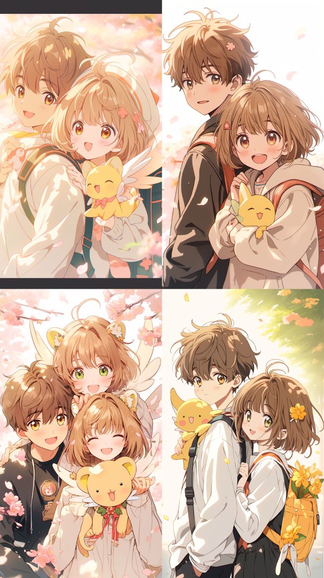 Midjourney Bot 更新时间:2024-03-13 00:03Cardcaptor Sakura, in the style of a cartoon, features an animated character profile picture featuring two characters. A boy with light brown hair and eyes is wearing a white shirt and black backpack, holding flowers. Standing next to him is a girl named KINOMOTO SAKURA, wearing a yellow shirt and light brown short curly hair. Both of them are smiling. The background includes golden leaves falling from trees and clouds floating in the sky, with "get" written in Japanese font. Ensure they can see their entire body, light colored anime style, high resolution, text "by CalynChan" in the bottom right corner, cute background, full body portrait, warm colors, close-up, centered composition, dreamy scenery, high details, and the best quality --s 188 --ar 9:16 --niji 5
