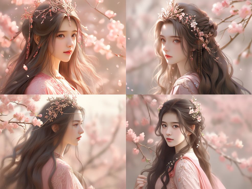 Midjourney Bot 更新时间:2024-03-13 00:09A beautiful girl from ancient China, dressed in pink and champagne colored attire, with long hair, a phoenix crown, and pearl hairpins, stood under a pear blossom tree. The contrast between reality and virtuality was achieved through delicate muscle texture treatment. When looking at the camera, the background was blurred, and the movie texture, depth of field, warm colors, and two-dimensional effects were achieved --ar 4:3 --niji 5