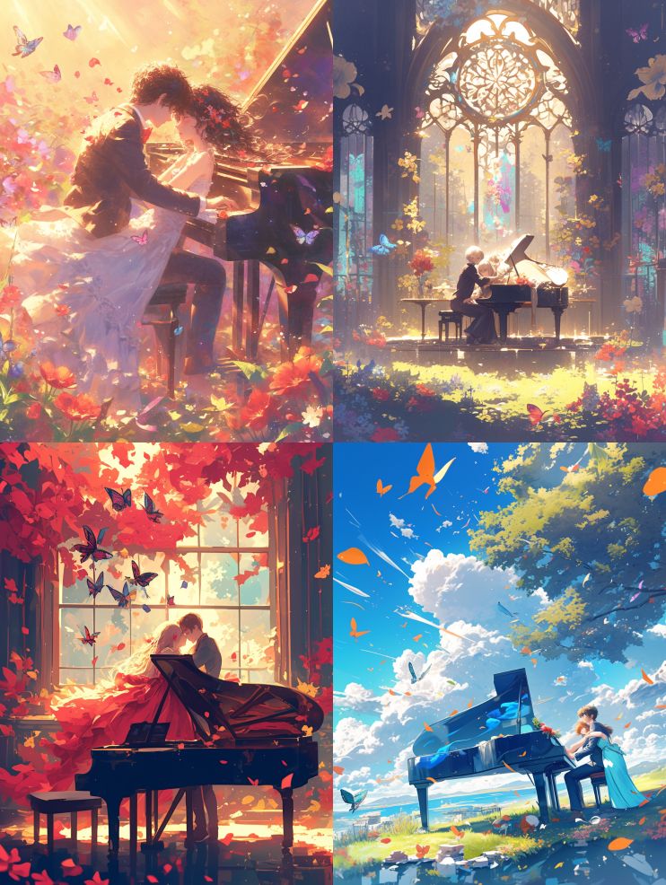 Midjourney Bot 更新时间:2024-03-08 00:09This scene depicts a piano with a highly anime aesthetic, featuring a man and a woman, a couple, hugging each other, accompanied by flowers and butterflies, depicting a dreamy atmosphere of the academy. The magnificent scenery in the background undoubtedly adds a sense of grandeur to the picture. The piano is composed of soft black and white keyboards, adorned with red flowers and exquisite butterflies. A poetic scene, accompanied by piano and flowers, stands frozen on the verdant green grass, allowing people to immerse themselves in it and feel the harmonious beauty of nature and culture. The perspective is agile, the lens is delicate, and every detail is very outstanding. The layout is very reasonable. --ar 3:4 --niji 6