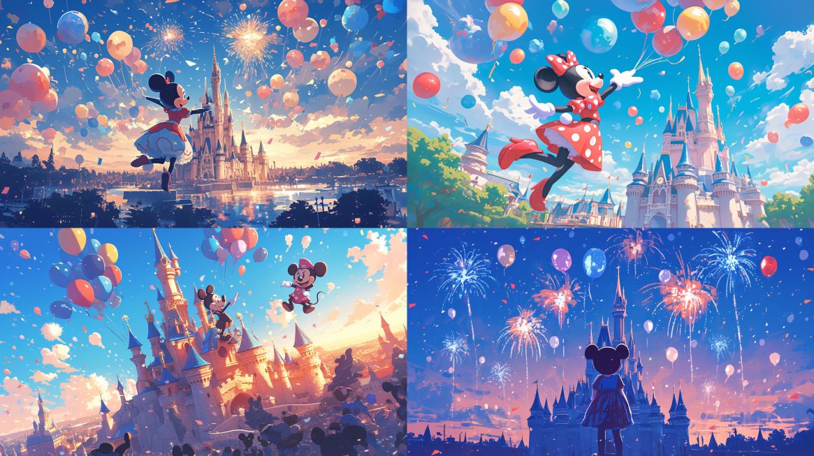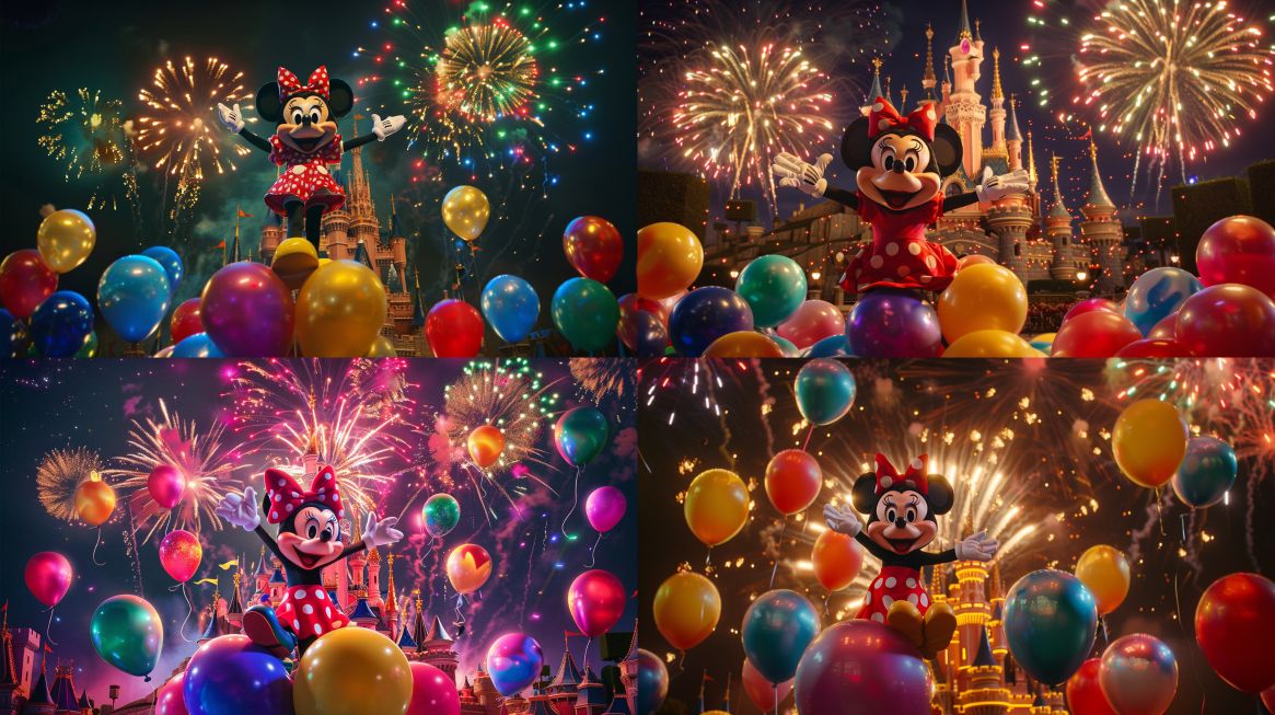 Midjourney Bot 更新时间:2024-03-08 00:13Minnie Mouse, on a castle surrounded by many colorful balloons with brilliant fireworks in the background, Disney style --s 379 --ar 16:9 --niji 6