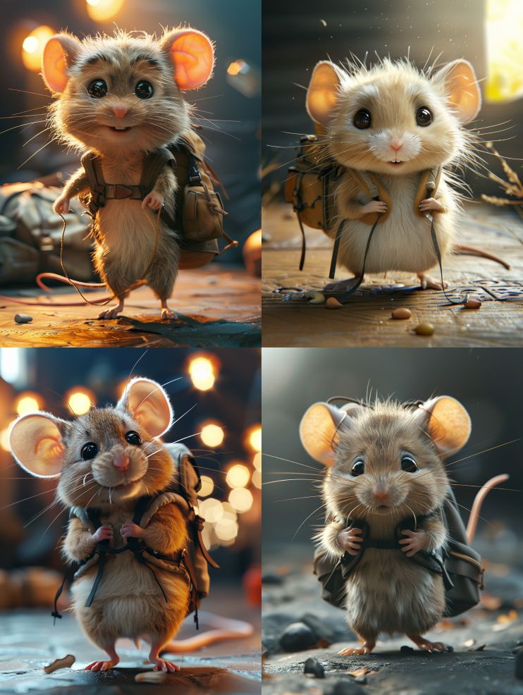 Midjourney Bot 更新时间:2024-03-09 00:00Cute, plump and fluffy mouse with a backpack on its back, interesting facial expressions, eyes that look very wise, various exaggerated movements, 3D characters, stage lighting background, elongated shapes, cartoon style, minimalism --s 201 --ar 3:4 --v 6.0