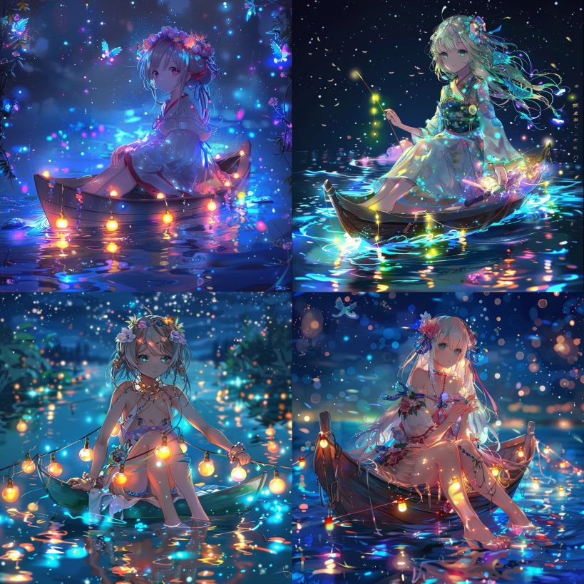 Midjourney Bot 更新时间:2024-03-07 00:08Fluorescent transparent clothing, a Pixiv competition champion, character sitting on a small boat on the water, glowing lights, cute cartoon design in Kawacy's style, detailed clothing, in Nightcore's style, bright luster, cute and colorful clothing, Yombe Art- S500 --ar 1:1 --v 6.0