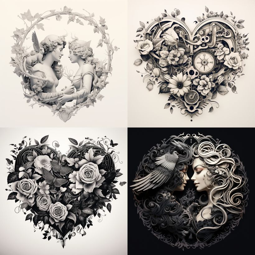 Midjourney Bot 更新时间:2024-03-04 02:46Design drawings suitable for laser engraving, monochrome, Valentine's Day theme --ar 1:1 --v 5.2