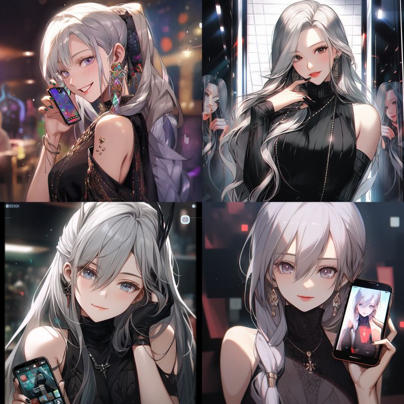 Midjourney Bot 更新时间:2024-03-01 00:070039, _8K, a thirty year old silver haired beauty with a phone in her ear, a smiling expression, black Bodycon skin, exquisite makeup, KTV background, perfect details --ar 1:1 --niji 5