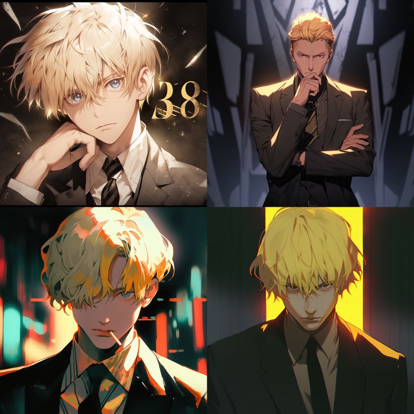 Midjourney Bot 更新时间:2024-03-01 00:080040, _8K, a 20-year-old man with yellow hair, a suit, haughty expression, KTV background, perfect details --ar 1:1 --niji 5