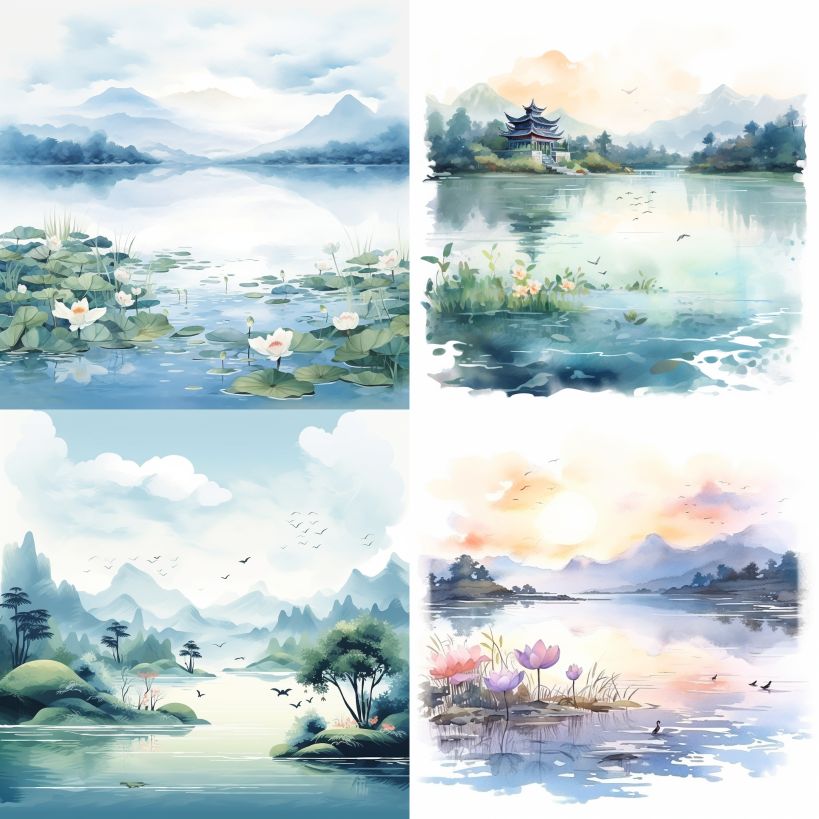 Midjourney Bot 更新时间:2024-03-01 00:08Flat illustration, calm lake, water ripple, watercolor painting style, Chinese style --ar 1:1 --v 5.2