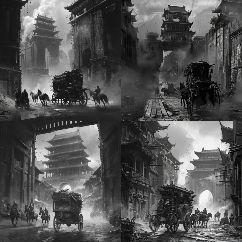 Midjourney Bot 更新时间:2024-02-29 00:14In the black and white scene, we gaze straight at the gate of an eastern city from afar. At night, the peaceful streets are empty of people. This is a city full of steampunk style, with towering city walls and stone brick paved streets showcasing the coexistence of ancient and future. In the center of the screen, an Eastern carriage filled with provisions is speeding out of the city gate. There is no one on the carriage, and a woman's head peeks out from the loaded provisions on the carriage. The wooden structure and steam mechanism on the carriage display the ingenuity of craftsmen and the ingenuity of technology. The horses pulling the vehicle were panting heavily, their muscle lines shining with strength and resilience in the sunlight. And behind the carriage, at the distant city gate, three soldiers wearing Chinese Ming Dynasty armor were closely following, their blurred figures appearing majestic and unstoppable in the steam filled streets. The entire scene is filled with tense and bizarre contrasts, as if showcasing a fantastical yet tense pursuit of the East. In the style of CryEngine, oil Portraits, lifestyle illustrations, rich layered, commercial arts, dark style, image by Ddrew Johnson, in the style of orientation, 32k UHD, charging characters, city Portraits, 19th century, accurate and detailed --ar 1:1 --v 6.0